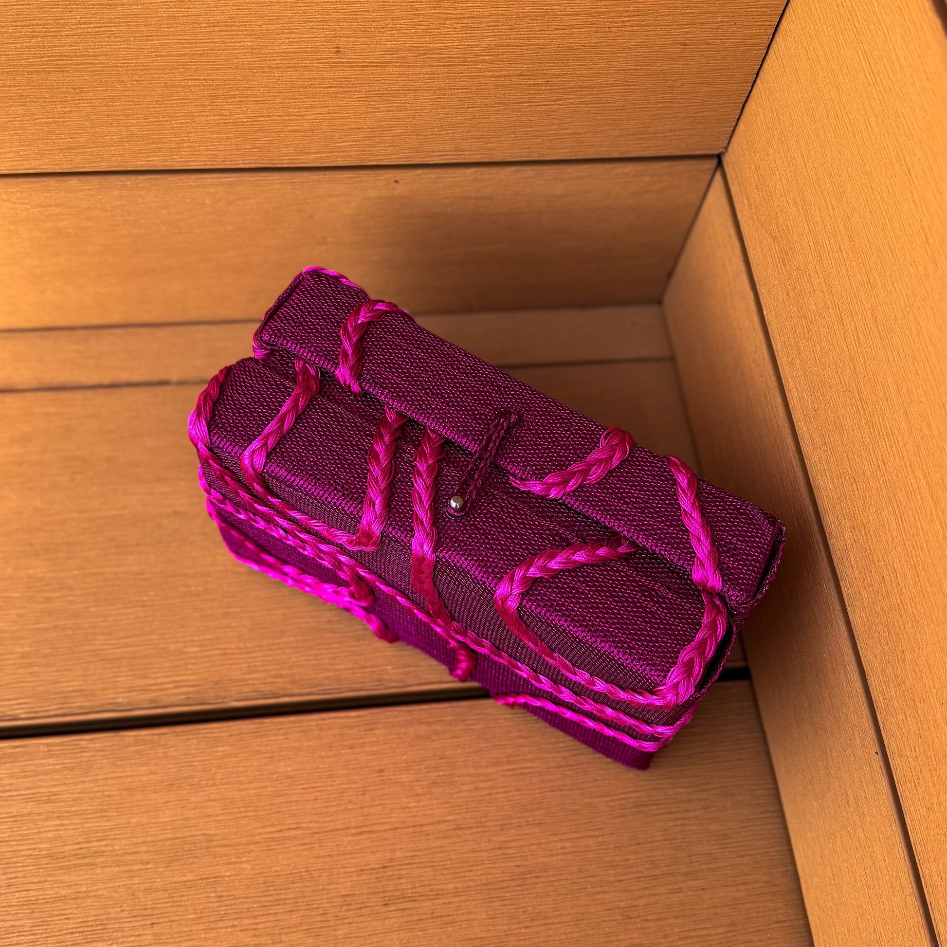 a striking sculptural piece where craftsmanship meets architectural elegance. Handcrafted in metallic asooke fabric, the clutch is elevated by intricate braided asooke cords that trace abstract, sculptural patterns across its structured silhouette.